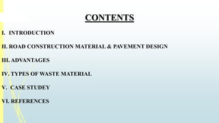 The document discusses the integration of waste materials in road construction as a solution to waste disposal issues and the demand for cost-effective construction materials. It covers various types of waste, including industrial ash and plastics, highlighting their benefits, processing methods, and real-world applications in road projects. Additionally, examples from Madhya Pradesh and Gujarat illustrate successful implementations of plastic waste in road building, emphasizing environmental and economic advantages.