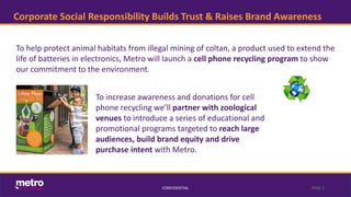 Metro is launching a cell phone recycling program in Philadelphia to support wildlife conservation by addressing the impact of coltan mining and ocean pollution. The initiative includes partnerships with local zoos and aquariums, educational outreach, and community events to enhance brand awareness and consumer engagement. The program aims to encourage donations through promotional incentives, with a focus on driving sales through strategic marketing during high-traffic periods.