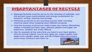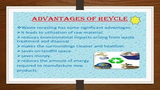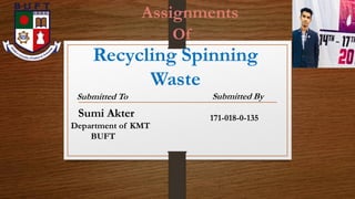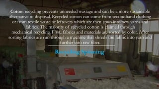 Cotton recycling prevents unnecessary waste and can provide a more sustainable alternative to disposal. Recycled cotton comes from sources like secondhand clothing or textile waste that is sorted by color then shredded and spun into new yarns and fabrics. The majority of recycled cotton undergoes mechanical recycling where fabrics are sorted and shredded into yarn and fiber.