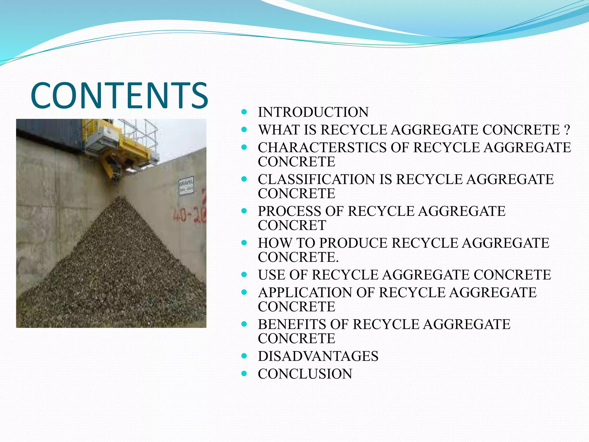 This document summarizes a study on recycled concrete aggregate conducted by G. Saichander, a 4th year civil engineering student. It discusses what recycled concrete aggregate is, its characteristics, classification, production process, uses, benefits, and disadvantages. Recycled concrete aggregate is produced from crushing waste concrete to achieve sustainable construction. It has properties like lower strength but can be used in applications like road base or sub-base to reduce costs and environmental impacts of virgin aggregate extraction and landfilling.