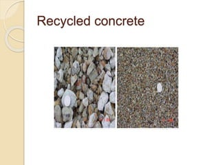 Recycled concrete is made from demolished or renovated concrete structures. The concrete is crushed and any rebar or other materials are removed. Crushed recycled concrete can be used as gravel for construction projects or as the aggregate in new concrete mixtures, providing it is free of contaminants. Using recycled concrete reduces costs and pollution compared to using newly quarried materials, and keeps concrete debris out of landfills. However, recycled concrete has reduced strength and density compared to natural aggregates.