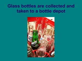 Glass bottles and containers are collected and taken to a glass recycling plant. There, contaminants are removed through various processes like magnets, sorting, and crushing. This recycled glass known as "cullet" is then shipped to various industries and used to make new products. Cullet can be used to make fiberglass insulation, road paint beads, countertops, dishes, and other items. It is a valuable material that saves energy and resources when recycled compared to using newly manufactured glass.