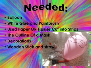 The document provides instructions for making a papier mache carnival mask using recycled materials. The instructions are: 1) inflate a balloon and draw a mask outline; 2) apply strips of paper soaked in a glue mixture to cover the balloon; 3) let dry for 24 hours and remove from balloon; 4) paint and decorate the mask; 5) attach a string or wooden stick to wear the mask. The mask can be made from used paper or tissues and decorated for carnival celebrations.