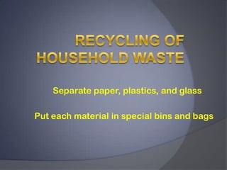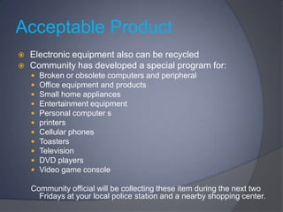 This document provides information about a community recycling program for household waste and electronic equipment. It instructs residents to separate paper, plastics, and glass into special bins and bags for recycling. The community has also developed a special program to collect broken or obsolete computers, office equipment, small appliances, entertainment devices, and personal electronics like printers, phones, toasters, TVs, and game consoles at the local police station and shopping center over the next two Fridays. Items like air conditioners, humidifiers, and hazardous waste are not acceptable.