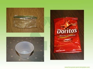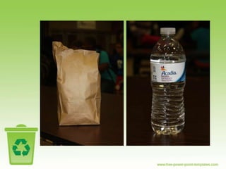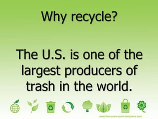 The document discusses recycling at SMS and why it is important. It notes that the U.S. produces a large amount of trash each year and recycling can help reduce waste. For every ton of paper recycled, 17 trees are saved. Plastic bottles take hundreds of years to decompose in landfills. The document encourages recycling common items found at school like paper, cartons, and bottles to help the environment. It states that if an item can be torn, it can likely be recycled.