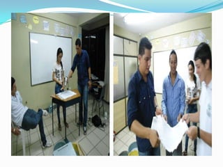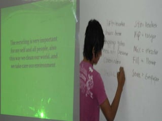 The document describes a project conducted by students at Academia Nacional de Sistemas in Florencia Caquetá, Colombia to teach them about the importance of recycling and the paper recycling process. The project involved students making paper from recycled paper over 4-5 classes. It provided details on the objectives, materials used, steps taken in each class, and conclusions. The overall goal was to cultivate environmental awareness while teaching English language skills.