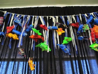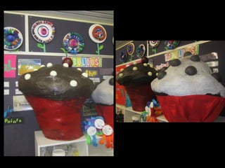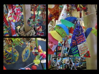 This document provides examples of art projects from different grade levels that utilize recycled materials. It includes projects such as paper mache fish made from plastic bottles and cardboard, recycled Christmas trees, totem poles made from cardboard boxes and newspaper, Picasso-inspired can portraits, recycled bottle top flowers, and paper mache ice cream cones made from recycled newspaper. It also provides information about Australian artist Fiona Hall and examples of her artwork that incorporate recycled materials like Coke cans and shredded dollar bills.