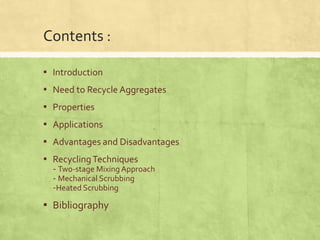 Recycled aggregates can be used as a substitute for natural aggregates in construction. They are produced from construction and demolition waste and have lower strength but also lower density than natural aggregates. While recycled aggregates provide environmental benefits and reduce costs, their use also faces challenges from a lack of standards and potential for water pollution. Effective recycling techniques include two-stage mixing, mechanical scrubbing, and heated scrubbing to remove adhered cement paste from recycled concrete pieces.