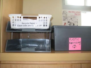 The document discusses ways to promote recycling at Kellett School to help the environment. It outlines that the school has introduced recycling bins for paper and plastic bottles, and aims to expand recycling to additional materials like batteries, electronics, and cardboard. Competitions between classes and students are proposed to encourage greater participation in recycling and reduce waste. Following the 4 R's of reduce, reuse, recycle, and replace is emphasized as helping cut pollution and global warming through collective recycling efforts.
