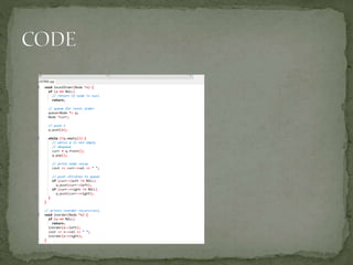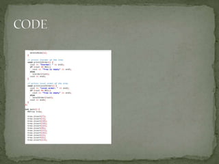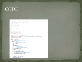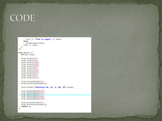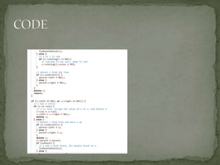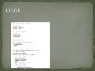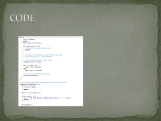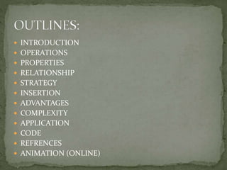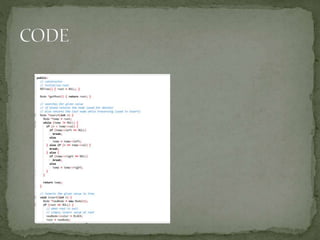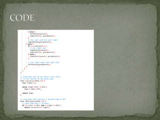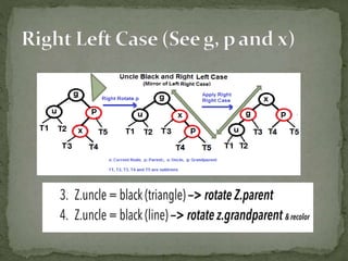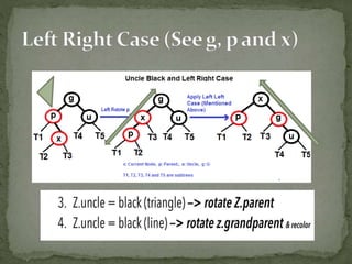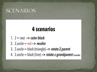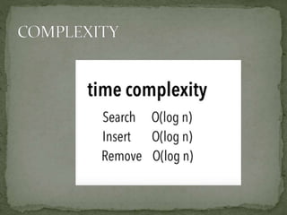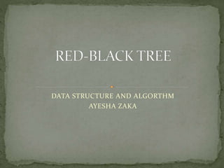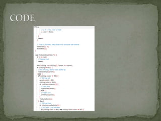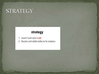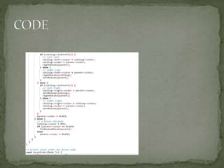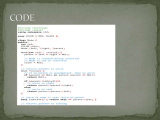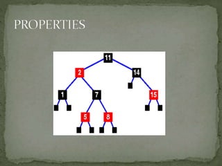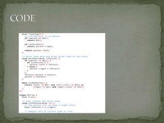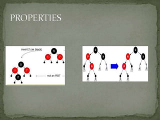 This document discusses red-black trees, which are self-balancing binary search trees. Each node of a red-black tree has an extra bit denoting its color, either red or black. Operations like insertion, lookup, and deletion can be performed in O(log n) time due to rebalancing techniques and restrictions on how nodes are colored. Some examples of using red-black trees include implementing maps and sets in libraries, organizing virtual memory, and CPU scheduling. Code examples and references are provided.
