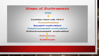 Erythrocytes, or red blood cells (RBCs), are circular biconcave cells that lack organelles and are primarily responsible for oxygen transport in the body, containing hemoglobin which gives blood its red color. The production of RBCs, known as erythropoiesis, occurs mainly in the bone marrow and involves several stages of development, from committed stem cells to mature erythrocytes over approximately seven days. Key factors influencing RBC production include erythropoietin, vitamin B12, and folic acid, while the lifespan of RBCs is about 120 days, with a negative feedback mechanism maintaining their constant levels.