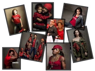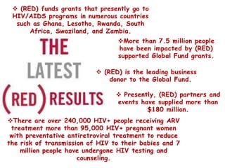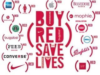 The document summarizes information about the (RED) campaign, which was founded by Bono and Bobby Shriver to raise money for HIV/AIDS programs in Africa. Over 34 million people have HIV globally, with over 22 million cases in Africa alone. (RED) partners with private companies to develop (PRODUCT)RED branded items, with a percentage of the profits going to the Global Fund to finance HIV treatment and care programs. The campaign targets socially-conscious consumers ages 20-50 through partnerships with brands in industries like coffee, fashion, technology, music and premium products. Through these partnerships and promotional efforts on social media platforms, (RED) has successfully raised hundreds of millions of dollars to support HIV/AIDS programs.