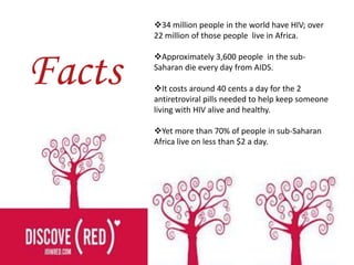 The document summarizes information about the (RED) campaign, which was founded by Bono and Bobby Shriver to raise money for HIV/AIDS programs in Africa. Over 34 million people have HIV globally, with over 22 million cases in Africa alone. (RED) partners with private companies to develop (PRODUCT)RED branded items, with a percentage of the profits going to the Global Fund to finance HIV treatment and care programs in sub-Saharan Africa. The campaign targets socially-conscious consumers across various demographics to help combat the statistics of HIV/AIDS on the continent through consumer purchases and raising awareness.