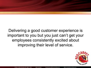 The Red-Carpet Service Kick-Start Coaching Program aims to improve customer service through employee engagement. It offers a structured four-step process to help organizations enhance their customer experience and drive repeat business and referrals. The program is currently available at a special rate for the first ten companies that sign up.