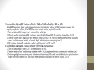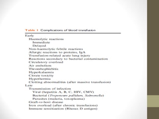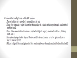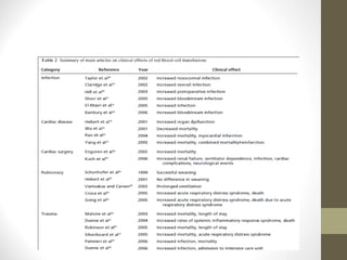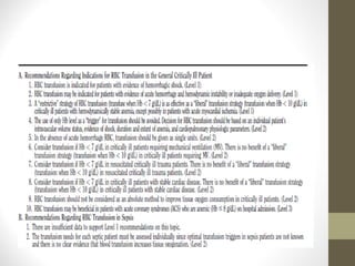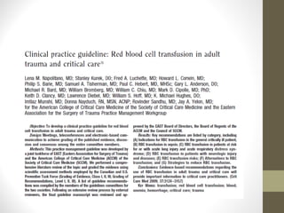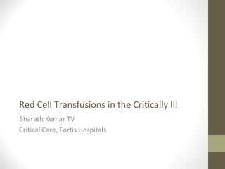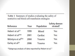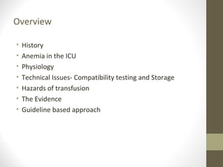 This document provides an overview of red cell transfusions in critically ill patients. It discusses the history of blood transfusions, reasons for anemia in ICU patients, physiological effects of red blood cells, technical aspects of blood compatibility testing and storage, hazards of transfusions, and evidence from studies on restrictive vs liberal transfusion thresholds. The TRICC study found no significant difference in mortality between restrictive and liberal transfusion strategies, though subgroups with lower illness severity saw benefits with restriction. Overall the document examines the risks and benefits of red cell transfusions in critical care.