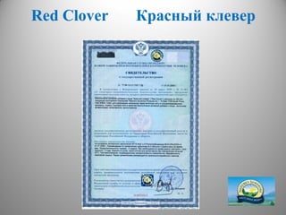 Документ описывает полезные свойства и применение красного клевера (Trifolium pratense), который используется в медицине для поддержки иммунной системы, очищения крови и нормализации обмена веществ. Указаны его фармакологические эффекты, включая снижение уровня холестерина и улучшение работы сердечно-сосудистой системы. Растение также применяют в народной медицине для лечения различных заболеваний, включая гинекологические и воспалительные.