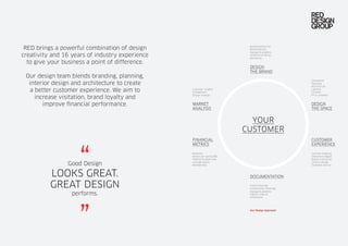 Red Design Group provides retail design services including branding, interior design, architecture, and customer experience design. They have extensive experience working with major retailers on store design projects. The document outlines their design approach and provides case studies summarizing store design projects for clients such as Uniqlo, Henry Bucks, Wine Republic, Mecca Maxima, and Toyota.