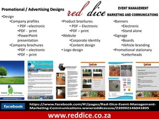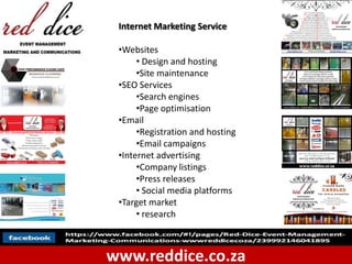 The document outlines the comprehensive offerings of an internet marketing and event management service provider, including website design, SEO, email campaigns, and social media management. It details services in event management for various occasions, audio-visual production, promotional services, and specialty industry solutions like flooring systems. Additionally, it provides links for more information and engagement with the company's social media presence.