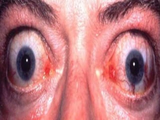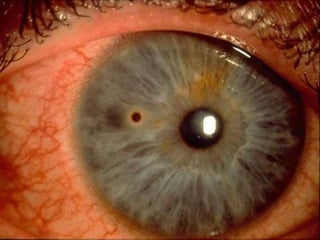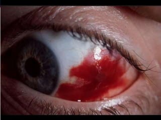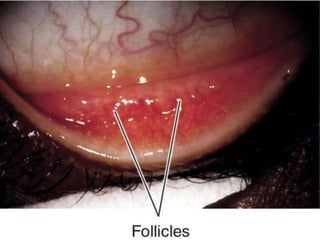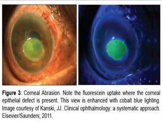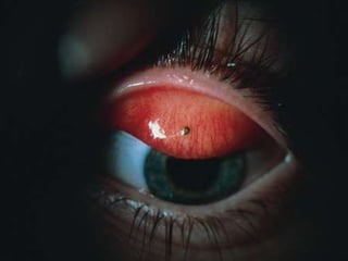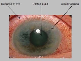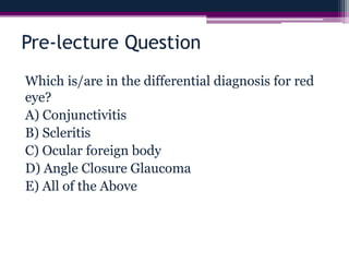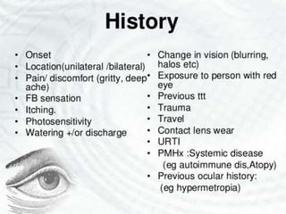 This document discusses the differential diagnosis and approach to evaluating red eye. It begins by listing conjunctivitis, scleritis, ocular foreign body, and angle closure glaucoma as possible causes of red eye. For acute onset painful red eye, common unilateral causes include corneal abrasion, foreign body, and trauma, while bilateral causes include chemical injury, contact lenses, dry eyes, and allergies. Acute painless unilateral red eye may be viral conjunctivitis or subconjunctival hemorrhage, while bilateral causes are blepharitis and allergies. Chronic red eye may result from blepharitis, dry eye, conjunctivitis, contact lenses, or thyroid eye disease.