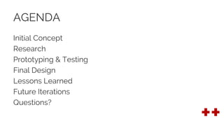 This document summarizes the process of designing a medical alert app called Red++. It describes initial research conducted including competitive analysis, surveys, use cases and card sorting. Low-fidelity paper prototyping was done and tested with users, revealing areas of confusion. This informed an updated site map and high-fidelity prototype, which addressed issues found in user testing such as sensor pairing and emergency notification placement. The process highlighted lessons around better defining the app's purpose upfront to reduce rework. Future iterations proposed expanding the emergency alert system and adding a health assessment.