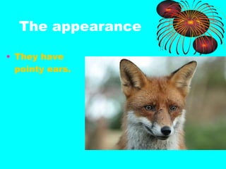 Red foxes have pointy ears and weigh around 6 kg, living up to 12 years. They inhabit deciduous forests and dens with two entrances, eating small animals like birds, eggs, and bunnies. Humans and lynxes prey on foxes, while foxes adapt to the cold by wrapping their tails around themselves and run quickly at speeds up to 1 km/hr to hunt using their 42 teeth.