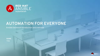 Ansible Automation can be used to deliver a high-level introduction of Red Hat Ansible Automation. This deck contains speaker notes and can be used to start discussions with customers. It provides a technical overview but not a deep dive. Follow-on discussions would leverage Red Hat Ansible Automation technical materials.