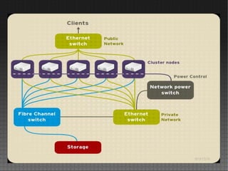 This presentation introduces clustering and RedHat clustering. It defines a cluster as two or more computers that work together to perform a task. It distinguishes between hardware and software clusters, with hardware clusters being more expensive. The major software cluster types are high availability, load balancing, and high performance. High availability clusters provide failover to prevent downtime. Load balancing clusters distribute work across servers. High performance clusters enhance application performance through parallel processing. The presentation recommends starting with RedHat clustering by downloading free documentation from the RedHat website.