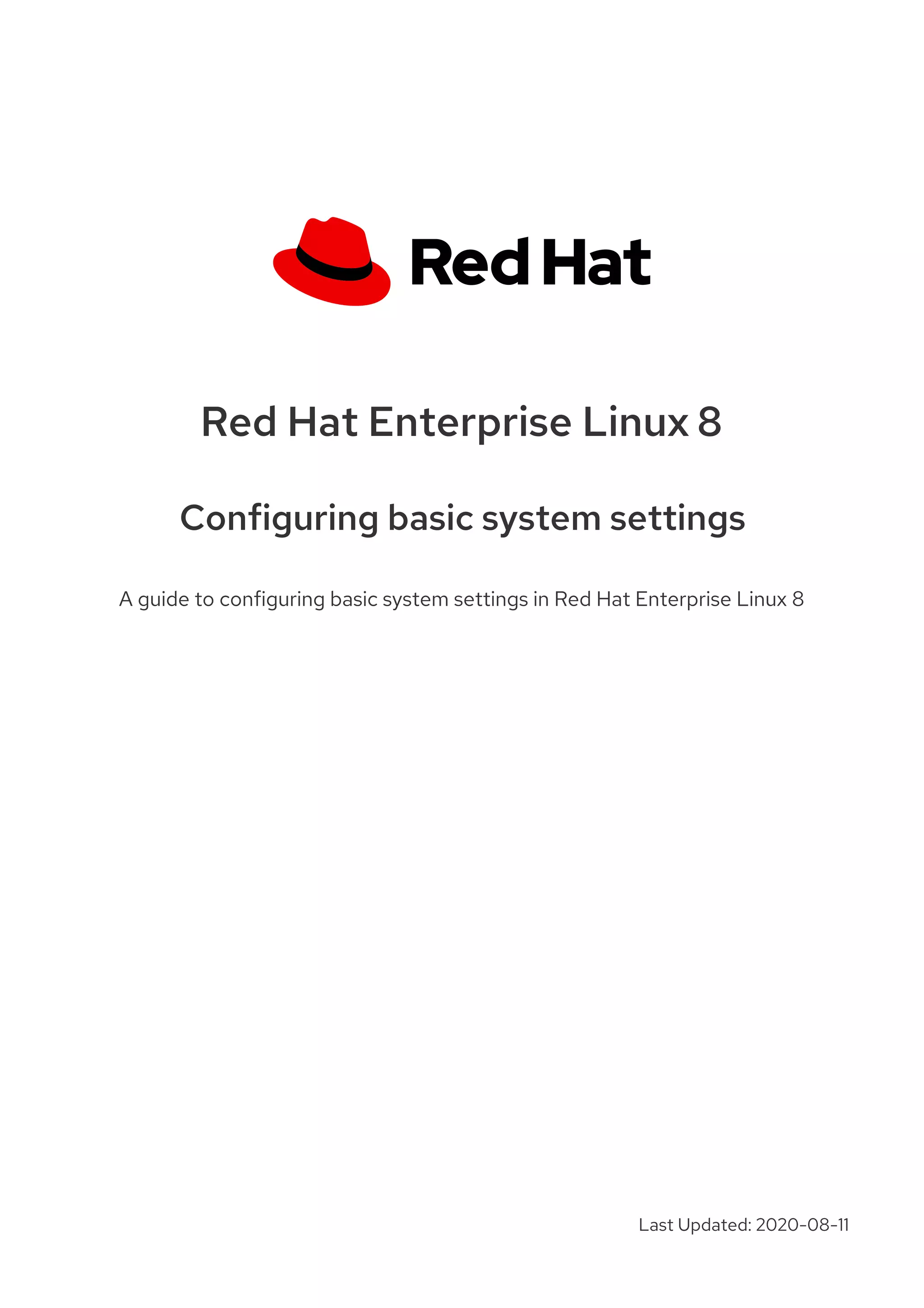 This document provides a summary of basic system administration tasks for Red Hat Enterprise Linux 8. It covers topics such as using the web console to manage system settings, installing and updating software packages with yum, configuring network settings, managing user accounts and services with systemd, and accessing log files and Red Hat support.