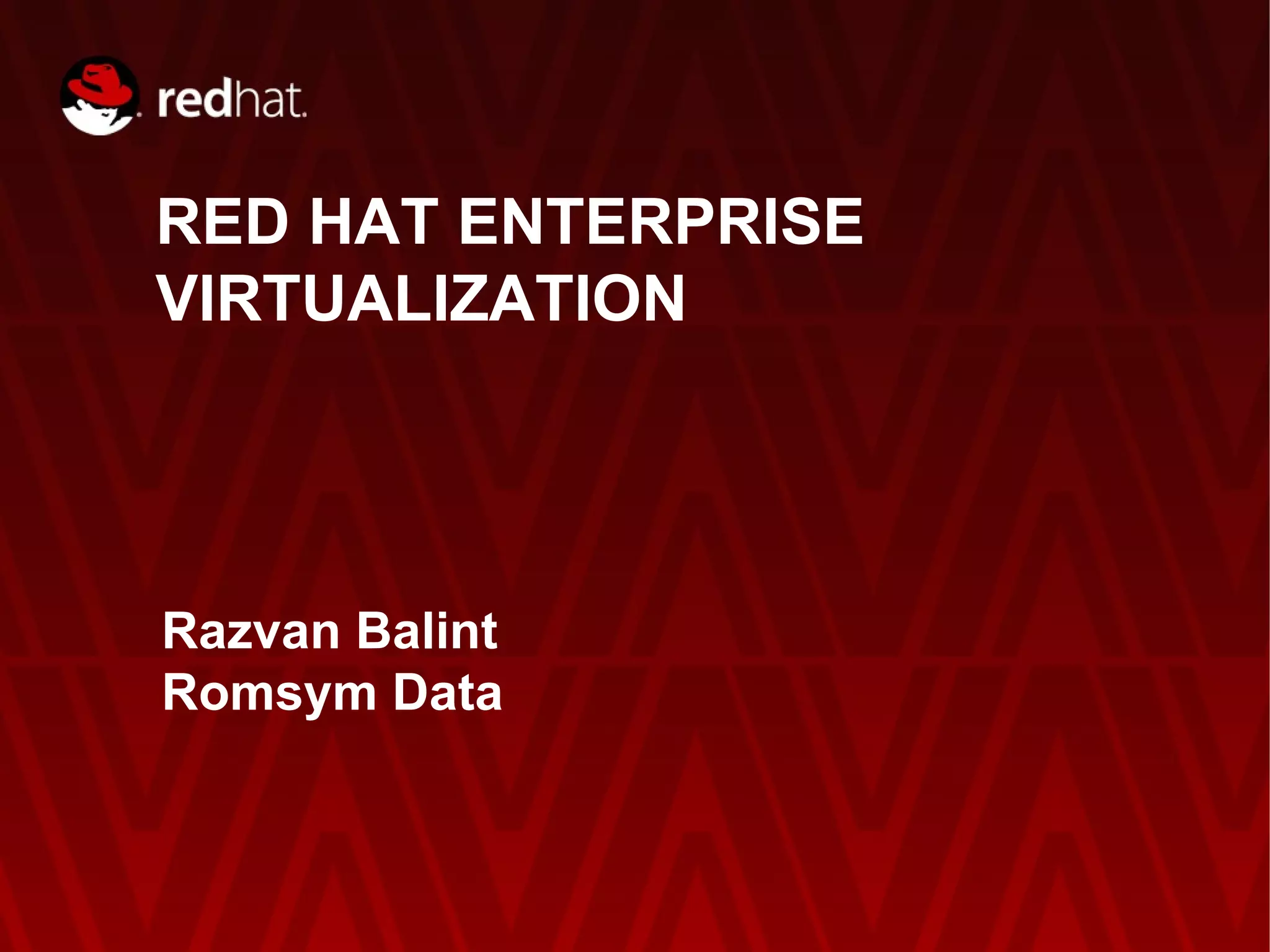 Red Hat Enterprise Virtualization provides an enterprise-grade platform for server and desktop virtualization with centralized management. It offers high performance, scalability, and security. RHEV leverages the Linux kernel and KVM for virtualization and has an ecosystem of thousands of partners. It offers lower costs than other solutions at 50-70% savings.
