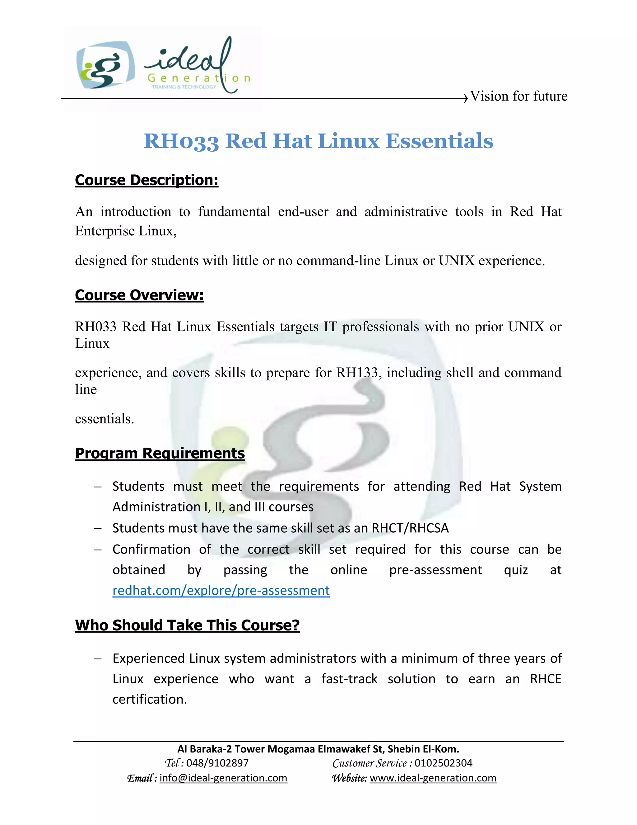 This document describes the RH033 Red Hat Linux Essentials course. The course is an introduction to fundamental end-user and administrative tools in Red Hat Enterprise Linux designed for those with little or no Linux experience. The course covers shell and command line essentials to prepare students for further Red Hat courses. It is aimed at IT professionals with no prior UNIX or Linux experience, experienced Linux administrators seeking RHCE certification, and experienced Solaris administrators. The curriculum is made up of 17 units covering topics like the Linux filesystem, users and permissions, shell usage, text editing and processing tools.