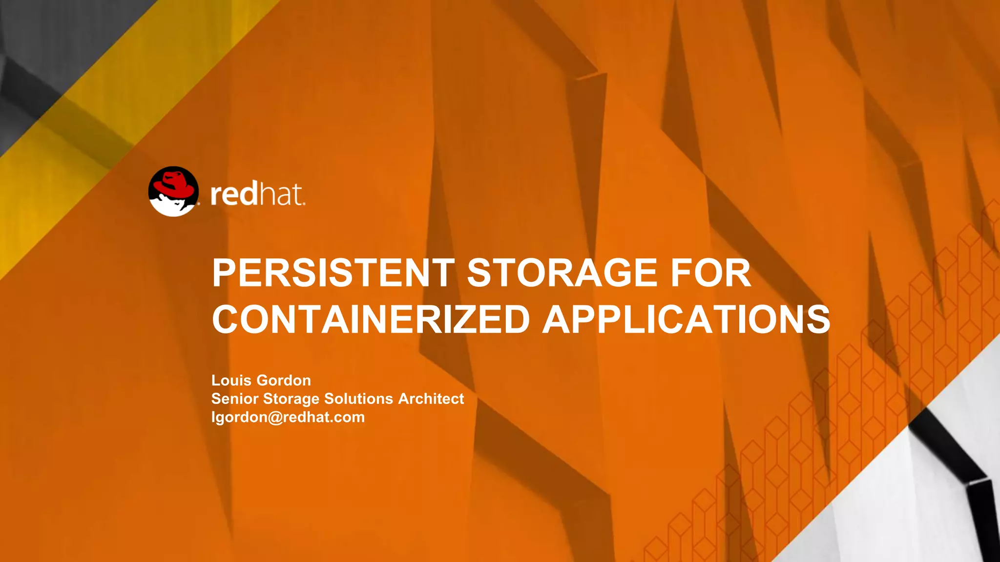This document discusses persistent storage solutions for containerized applications. It describes how containers provide benefits like faster development and deployment cycles compared to virtual machines. However, most applications still require persistent storage for data. The document outlines requirements for container storage solutions, such as scalability, resilience, flexibility and being software-defined. It presents Red Hat Storage as a solution, highlighting features like replication, erasure coding and snapshots. Red Hat Storage can provide persistent storage to containers using technologies like Ceph, Amazon EBS, NFS and GlusterFS.