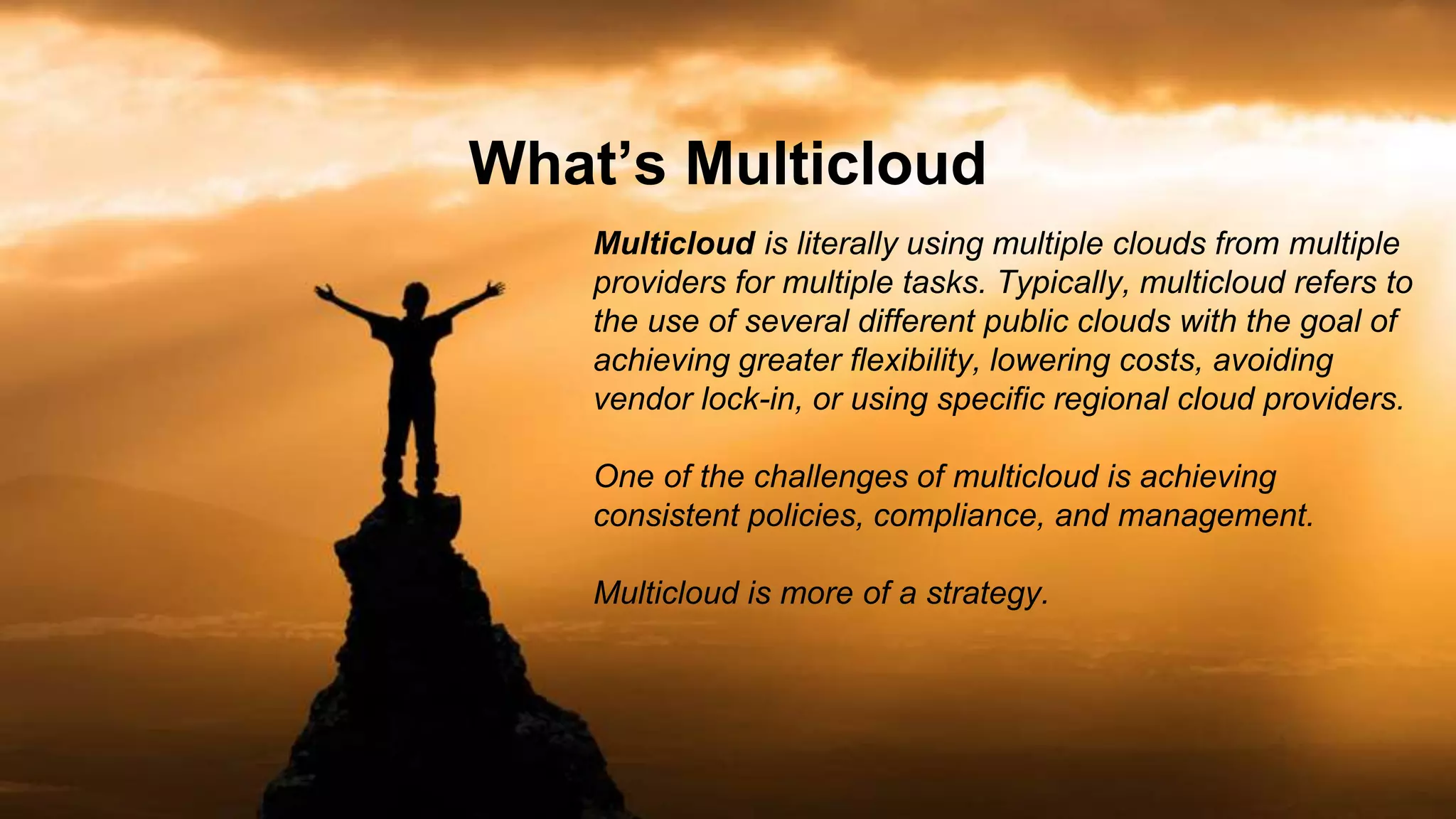 The document discusses multicloud and hybrid cloud strategies, emphasizing the use of multiple cloud providers for flexibility and reduced costs while highlighting challenges in policy and management consistency. It outlines key considerations for organizations, including defining migration goals, assessing current situations, and selecting appropriate cloud environments. Additionally, it addresses potential pitfalls and the importance of having an exit strategy and knowing bandwidth and storage needs.