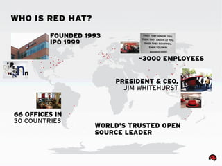 The document discusses the benefits of open source business models for communities, suppliers, and customers. It notes that open source allows small contributions ("trim tabs") to influence large organizations, similar to how small rudders guide large ships. Examples are given of large user bases and partnerships for Red Hat's open source software. The document advocates that supported open source can address enterprises' needs for stability, support, and standards compliance while providing financial benefits over proprietary software. Wide adoption of supported open source by enterprises is presented as key to the growth of the open source industry.