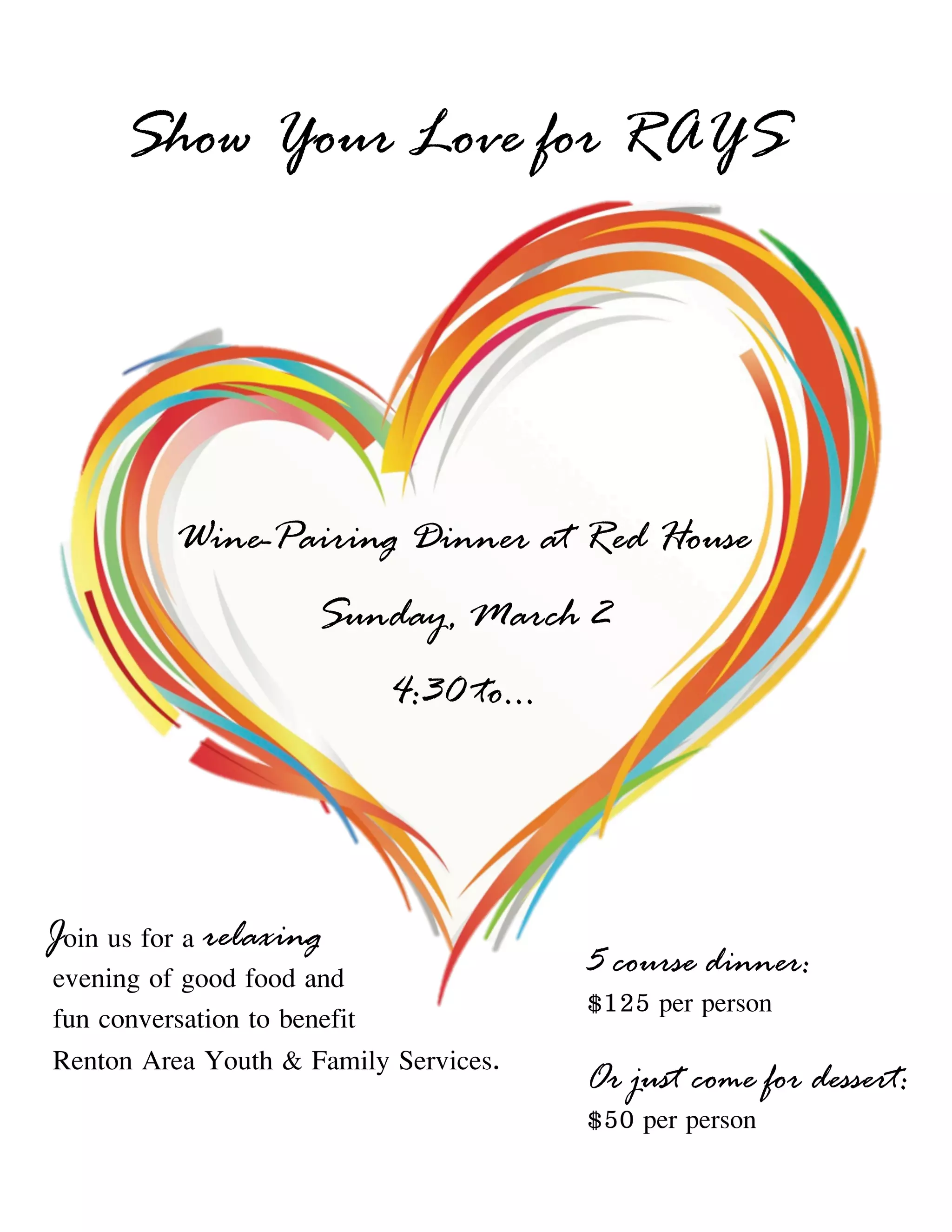 A wine-pairing dinner will be held at Red House on Sunday, March 2, at 4:30 PM, to support Renton Area Youth & Family Services, offering a 5-course dinner for $125 or a dessert option for $50. The event aims to provide counseling and support for vulnerable families and youth, with only 50 tickets available for a memorable experience. RSVP is required via the provided website or contact information.
