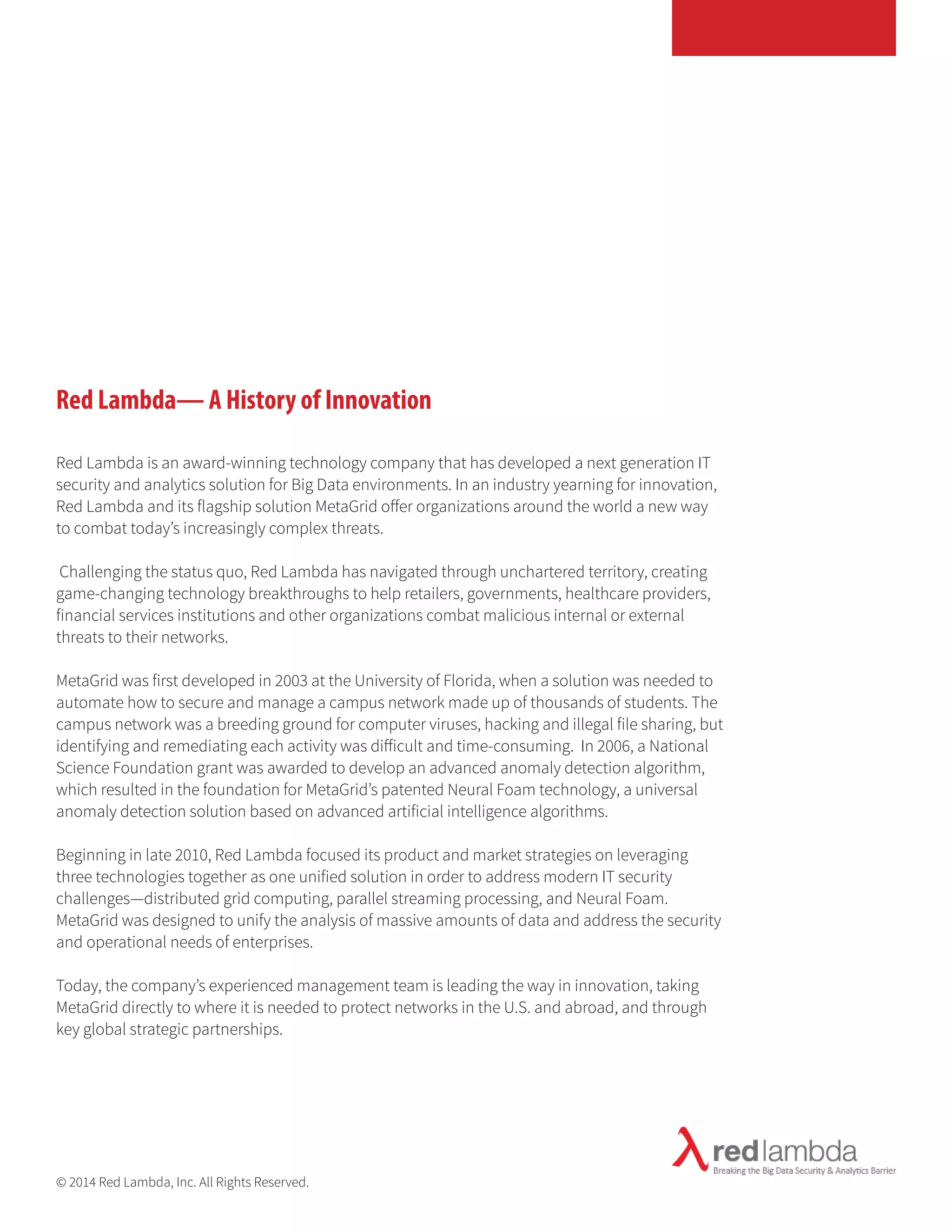 Red Lambda is a technology company that developed MetaGrid, an advanced threat detection and analytics solution built to address security challenges in big data environments. MetaGrid was first created at the University of Florida to automate security and management of a large campus network. It applies distributed grid computing, parallel streaming processing, and Red Lambda's patented Neural Foam technology to analyze massive amounts of security data from various sources in real-time to detect threats and anomalies faster than other solutions. Red Lambda aims to help organizations shift the balance of power in cybersecurity through MetaGrid's unique ability to process data at streaming speed for unprecedented threat detection capabilities.