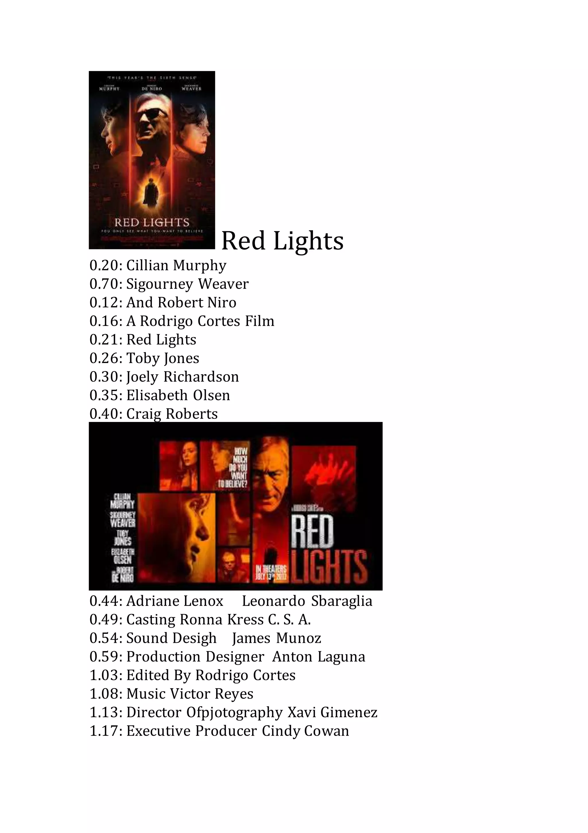 This document provides credits for the film "Red Lights" including the lead actors Cillian Murphy and Sigourney Weaver, supporting actors like Robert De Niro, and credits for the director, writers, producers, cinematographer, film editor, and others involved in the production.
