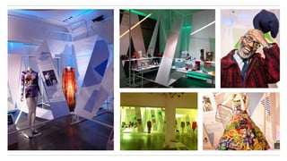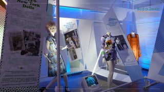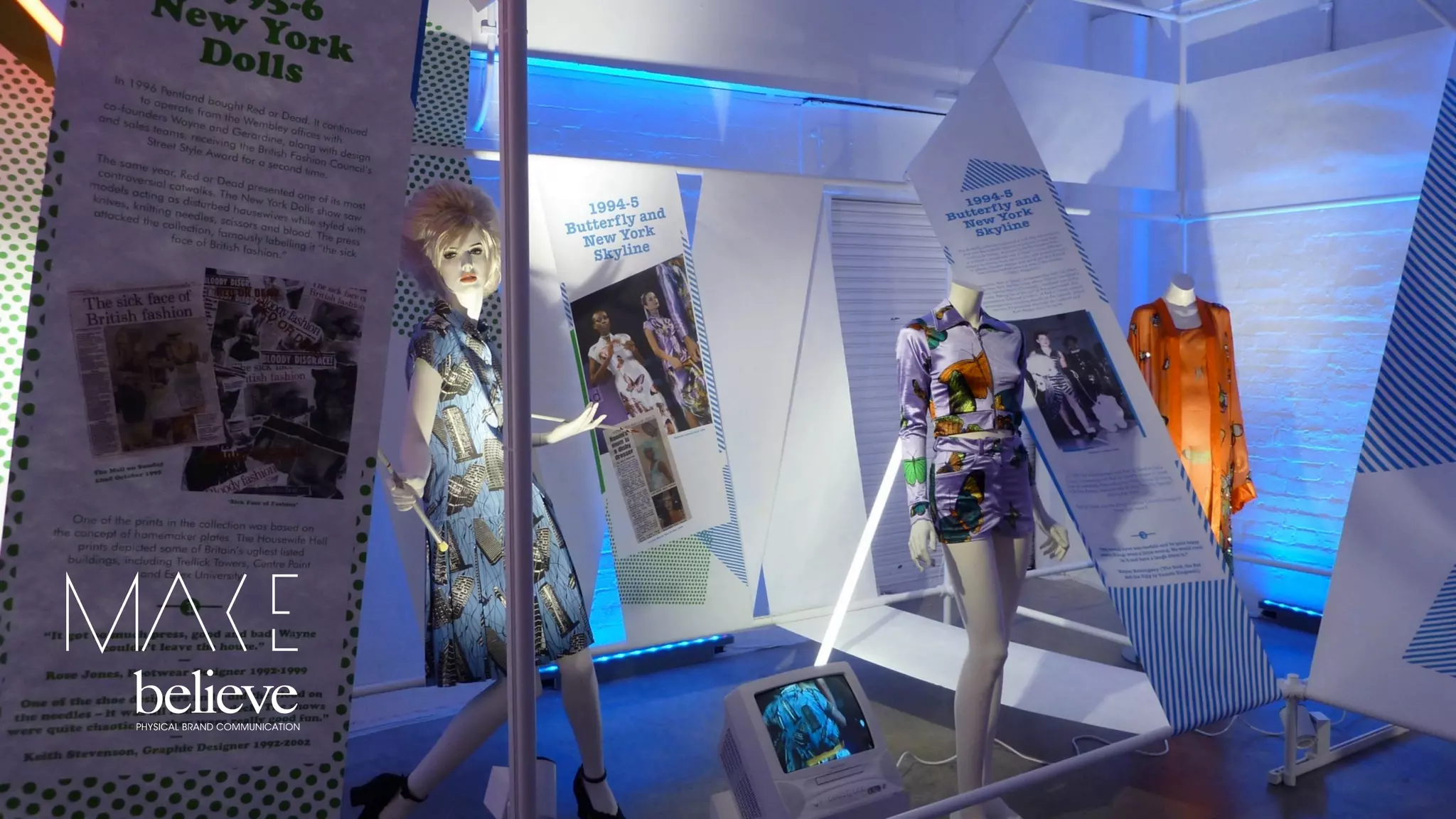 Make Believe was commissioned to design an exhibition celebrating Red or Dead's 30th anniversary at Dray Walk Gallery. They printed the brand's history on a continuous roll of paper and wrapped it around a scaffold structure resembling a printing press, creating spaces to display exhibition items. This demonstrated the scale and fame of Red or Dead through an immersive, print-focused installation alluding to the label's design heritage.