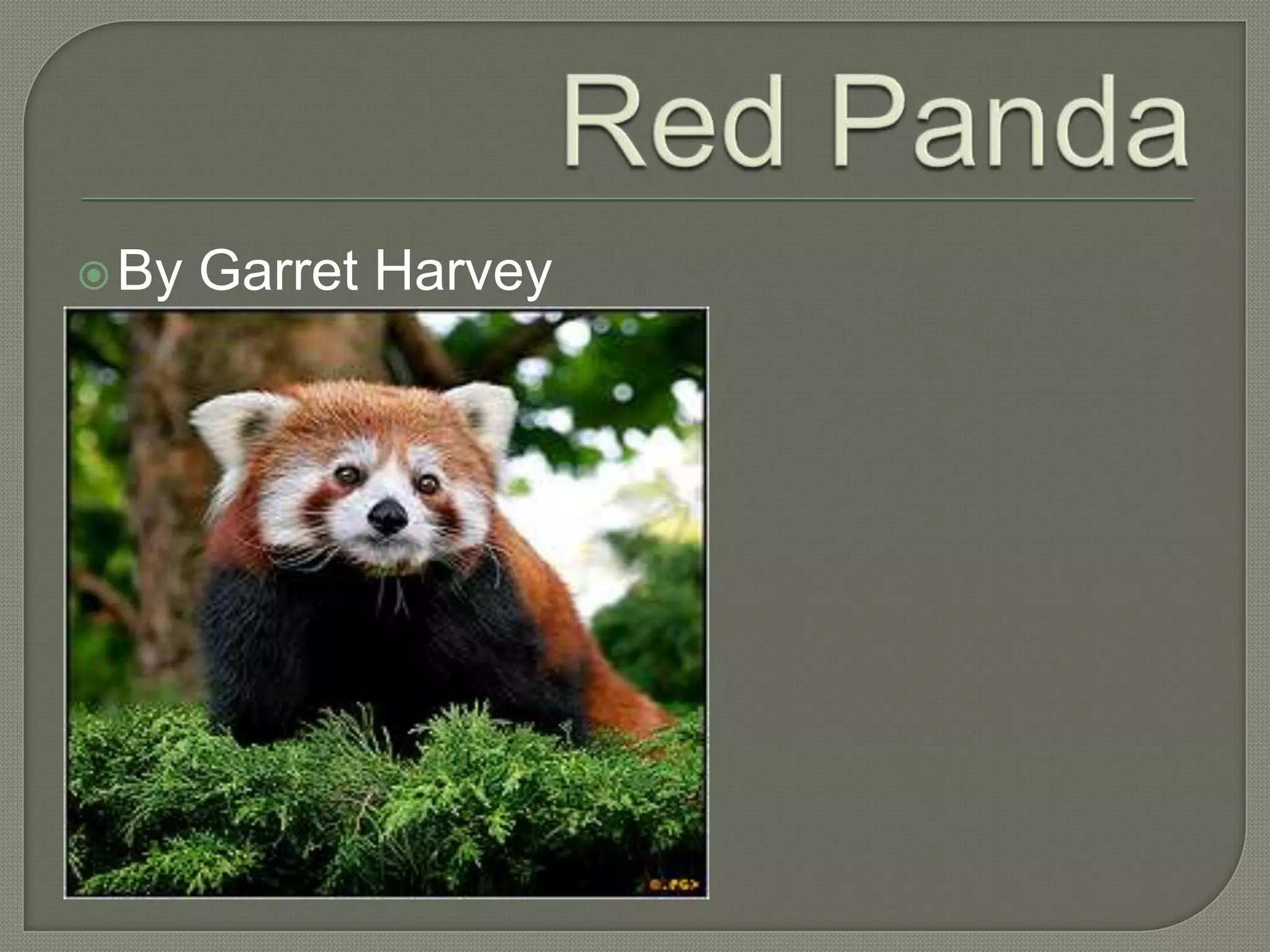 The document discusses the red panda, providing its scientific name, habitat in mountains in Burma and China between 2,200 and 4,800 meters in elevation, diet of bamboo, fruit, berries and seeds, physical description with a white face and black and white rings on its tail, breeding of live young, behaviors of spending days curled up in trees and climbing, diet consisting of 95% bamboo, and conclusion that red pandas are interesting with many cool traits.