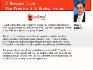 This document summarizes information from a real estate company called Appleseed Homes. It discusses the company's commitment to customer service over 30 years and its offices across Staten Island, Brooklyn, and New Jersey. It promotes the benefits of using a real estate agent to sell a home, such as helping establish the best price, marketing the home, and facilitating the transaction. It outlines Appleseed's marketing program and mortgage services and emphasizes their priority of customer service.