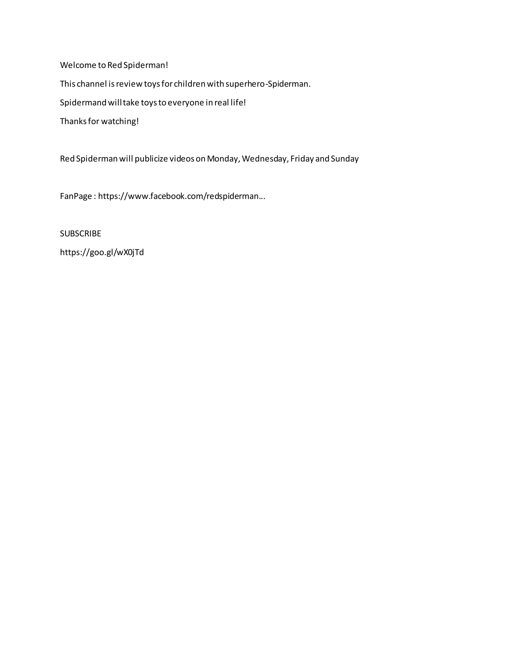 The document introduces a YouTube channel called redspiderman that reviews superhero-themed toys for children. It highlights the presence of Spiderman in real-life scenarios with the toys. Videos are scheduled to be published on Mondays, Wednesdays, Fridays, and Sundays, and it includes links to a fan page and subscription.