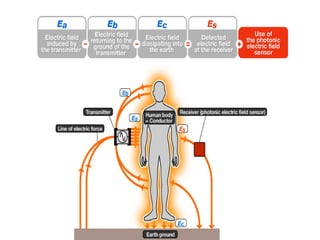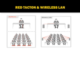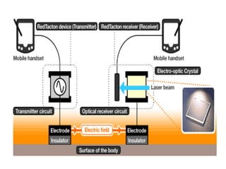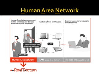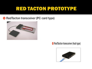 Red Tacton is a novel human area network technology enabling safe and high-speed data transmission through short-range wireless communication. Utilizing the electro-optic properties of a weak electric field on the human body, it allows for efficient data transfer, minimal power usage, and enhanced security. Compared to existing technologies like Bluetooth, Red Tacton offers improved performance, particularly in crowded environments where packet collision is a concern.