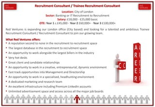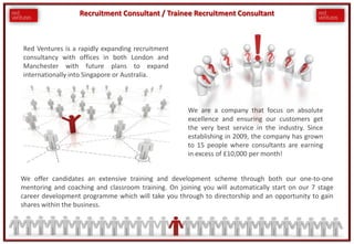 Red Ventures is a rapidly expanding recruitment consultancy seeking a Trainee Recruitment Consultant or Recruitment Consultant for their London office. The role offers a basic salary of £18,000-£25,000 with commission of up to 30% and an opportunity to earn £45,000 in the first year. Red Ventures offers extensive training, fast career progression including opportunities for management, and high earnings potential with consultants earning over £10,000 per month.