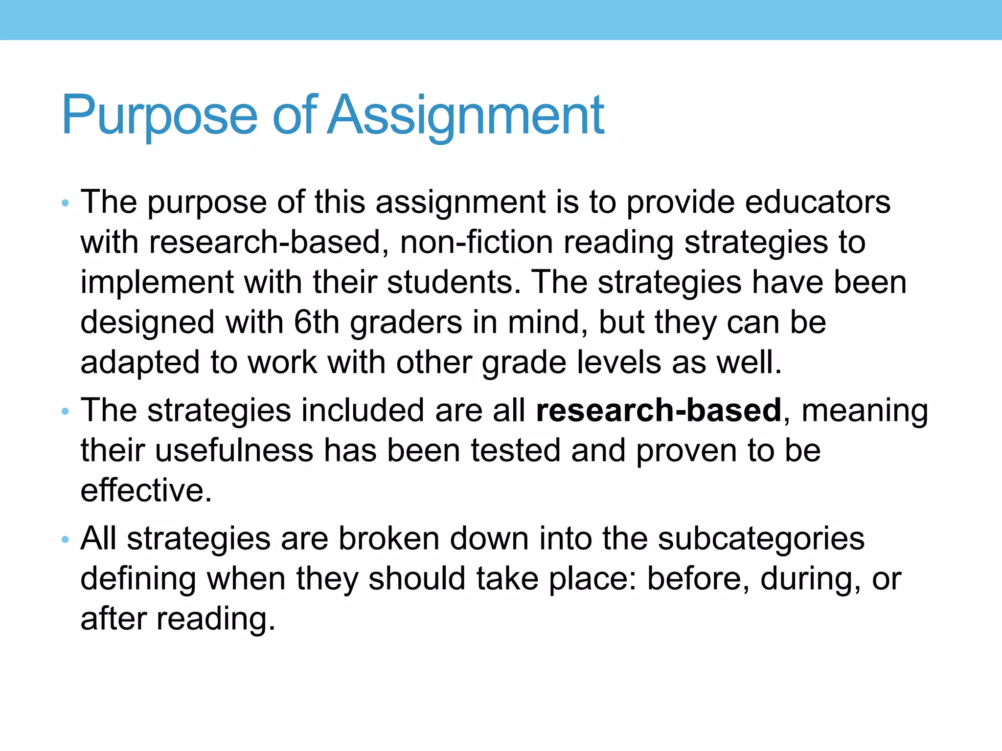 The document outlines research-based non-fiction reading strategies for educators to implement with students, particularly 6th graders. It divides the strategies into three categories: before, during, and after reading. Some of the before reading strategies include having students preview the text, make predictions, and activate their prior knowledge. During reading strategies involve asking questions, pausing to summarize, and highlighting important information. After reading strategies provide ways for students to record what they learned, generate questions, and complete a summary or exit slip to assess comprehension.