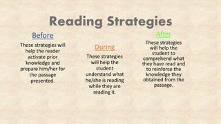 This document outlines reading strategies that teachers can use before, during, and after reading nonfiction texts with 6th grade students. The before strategies include pre-teaching vocabulary, previewing the text, and establishing a purpose. During reading, teachers should model think-alouds, have students monitor comprehension using fix-up strategies, and make notes using stop-and-jot. After reading, students can ask and answer questions, create graphic organizers, summarize the text, and reread sections they did not understand fully.