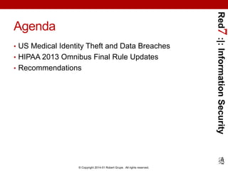 This document discusses medical identity theft and data protection. It begins by outlining statistics on healthcare data breaches in the US, including their high costs and common causes. It then details types of medical identity theft and consequences for victims. The document also covers updates to HIPAA regulations and provides recommendations for securing patient data, including following security best practices, conducting risk assessments, and documenting policies and processes.