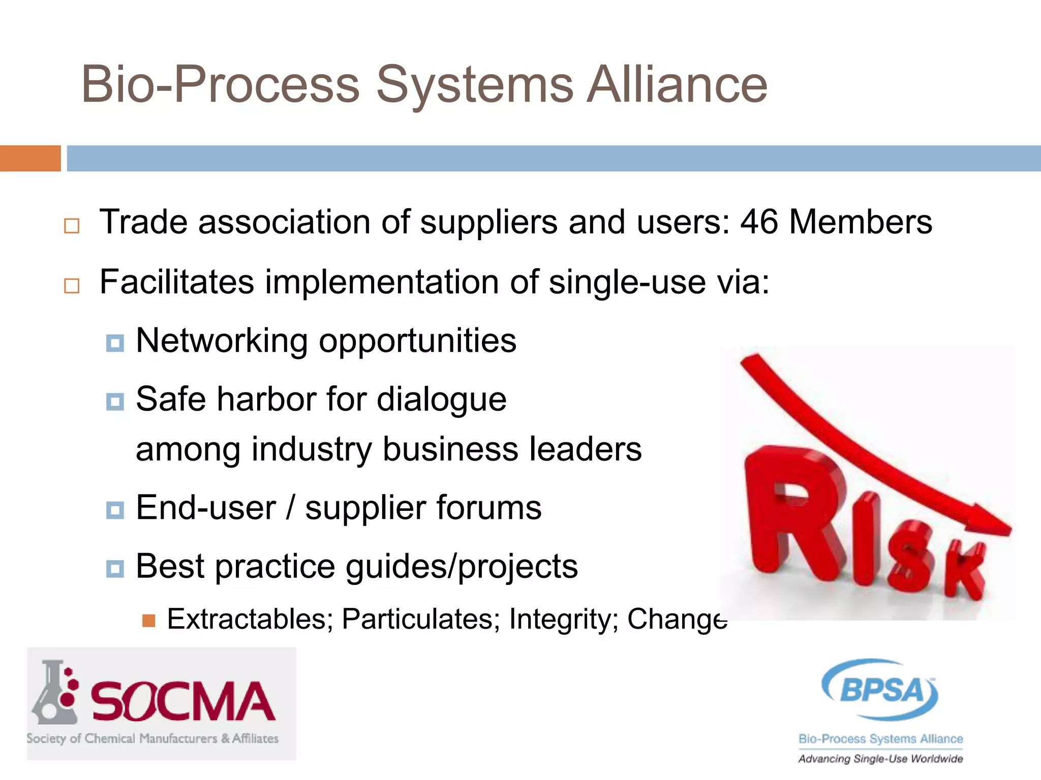 This document summarizes a report published by the Bio-Process Systems Alliance (BPSA) regarding recommendations for testing, evaluation, and control of particulates from single-use process equipment. The BPSA is a trade association that facilitates implementation of single-use technologies through various initiatives. The report was created by a working group consisting of subject matter experts from single-use technology suppliers and end users. It provides guidance on characterizing and minimizing particulate levels throughout the lifecycle of single-use technologies, including manufacturing, storage, handling and end use. It also discusses investigation and mitigation of particulate deviations. The BPSA recommends further work to develop standardized measurement methods, application-specific requirements, a catalog of particle types,
