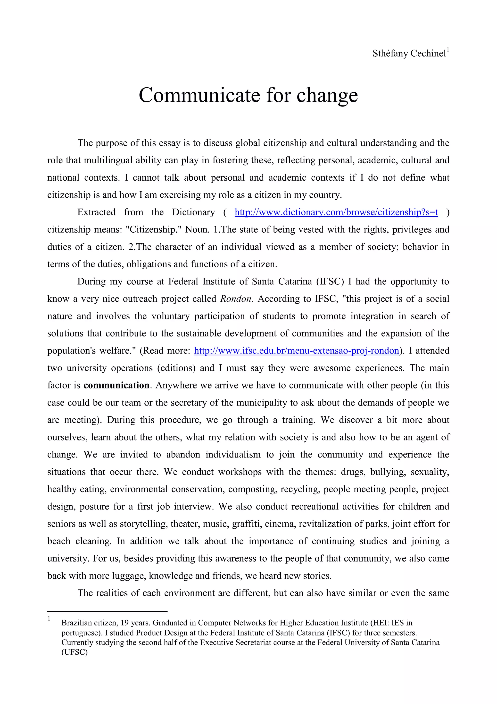 This essay discusses the importance of global citizenship and cultural understanding, particularly through multilingualism, within personal, academic, and national contexts. It highlights experiences from outreach projects at the Federal Institute of Santa Catarina, emphasizing the role of communication in fostering social cohesion and awareness of cultural diversity. The author advocates for multilingualism as a means to break down barriers, build relationships, and enhance opportunities in a globalized world.