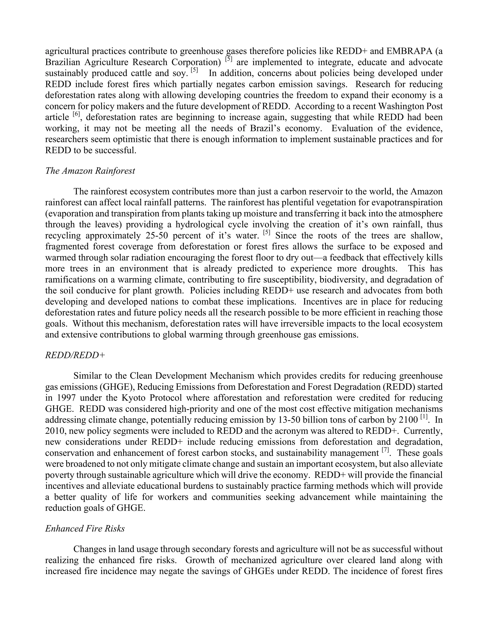 The document discusses REDD (Reducing Emissions from Deforestation and Forest Degradation), a mechanism to reduce deforestation in developing countries. The Amazon rainforest stores a significant amount of carbon but has faced increasing deforestation, especially for agriculture. REDD financially incentivizes sustainable farming practices to reduce emissions while allowing economic growth. However, increased deforestation and agriculture also increase fire risks, which could undermine carbon savings if not properly monitored and managed under REDD policies. More research is still needed but REDD is seen as a promising approach if continuously improved and enforced.