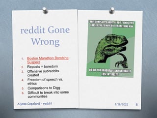 Reddit was founded in 2005 by Steve Huffman and Alexis Ohanian. It was later bought by Conde Nast Publications. Reddit operates out of San Francisco and functions as a social news aggregation site where users can discover and share new content through customizable subreddits on various topics. Users can also vote on posts and comments to determine their popularity through a karma points system.