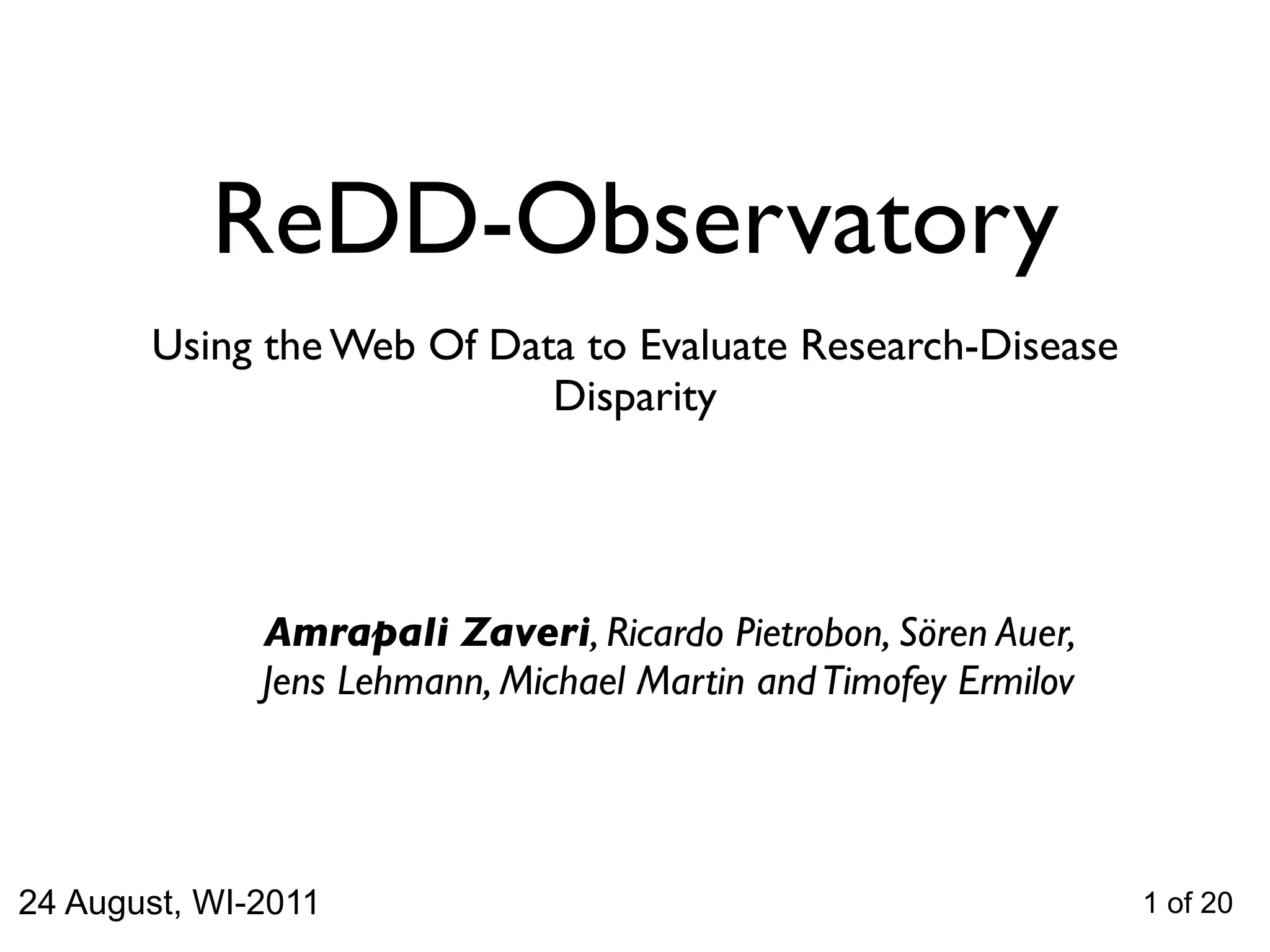The document describes the ReDD-Observatory project, which aims to evaluate disparities between areas of biomedical research funding and the global burden of disease. It does this by converting public health and biomedical research datasets into linked open data and analyzing the relationships between diseases and research topics. The project seeks to address limitations in accessing and integrating data on research and diseases by leveraging semantic web and linked data technologies.